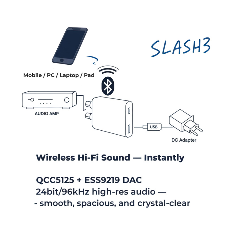 SLASH3 하이파이 블루투스 DAC 리시버 LDAC, AptX Adaptive, AptX HD 등 모든 고음질 코덱 지원! 기존 앰프나 스피커에 연결하여 스마트폰의 음악을 초고음질 무선 사운드로 즐기세요.
