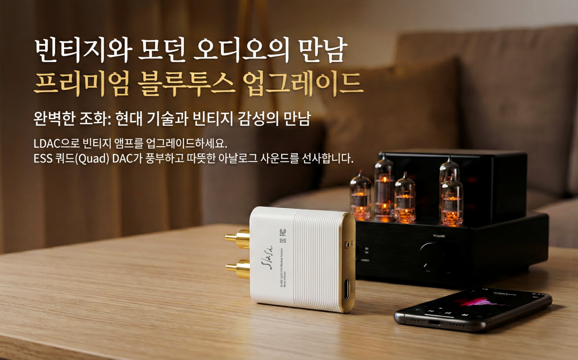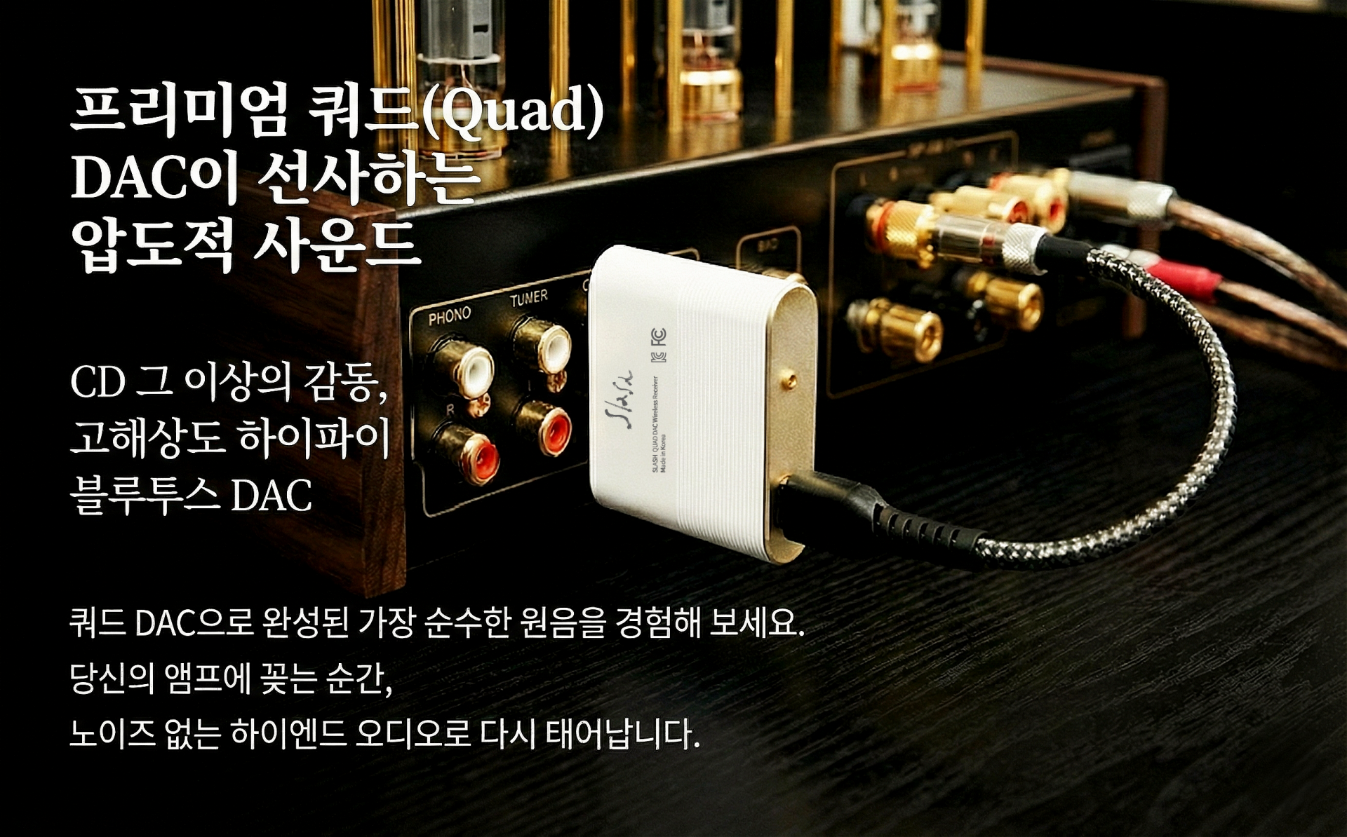 진정한 오디오파일 사운드 (ESS Quad DAC) 프리미엄 ESS ES9219 Quad DAC를 탑재하여 업계 최고 수준인 130dB SNR(신호 대 잡음비)을 구현했습니다. 이 작은 기기가 고성능 사운드 카드 역할을 수행하여, 오래된 빈티지 앰프를 초저노이즈의 현대적인 하이파이 시스템으로 완벽하게 변신시켜 줍니다.