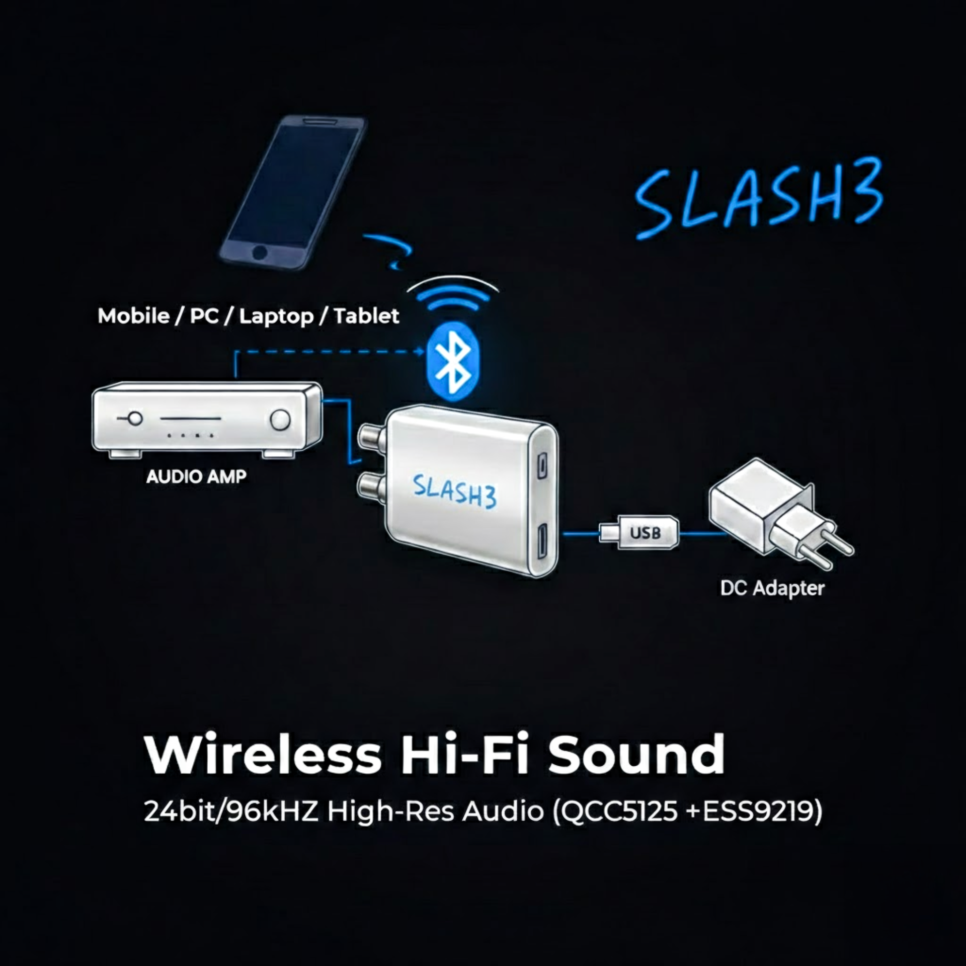 SLASH3 하이파이 블루투스 DAC 리시버 LDAC, AptX Adaptive, AptX HD 등 모든 고음질 코덱 지원! 기존 앰프나 스피커에 연결하여 스마트폰의 음악을 초고음질 무선 사운드로 즐기세요.