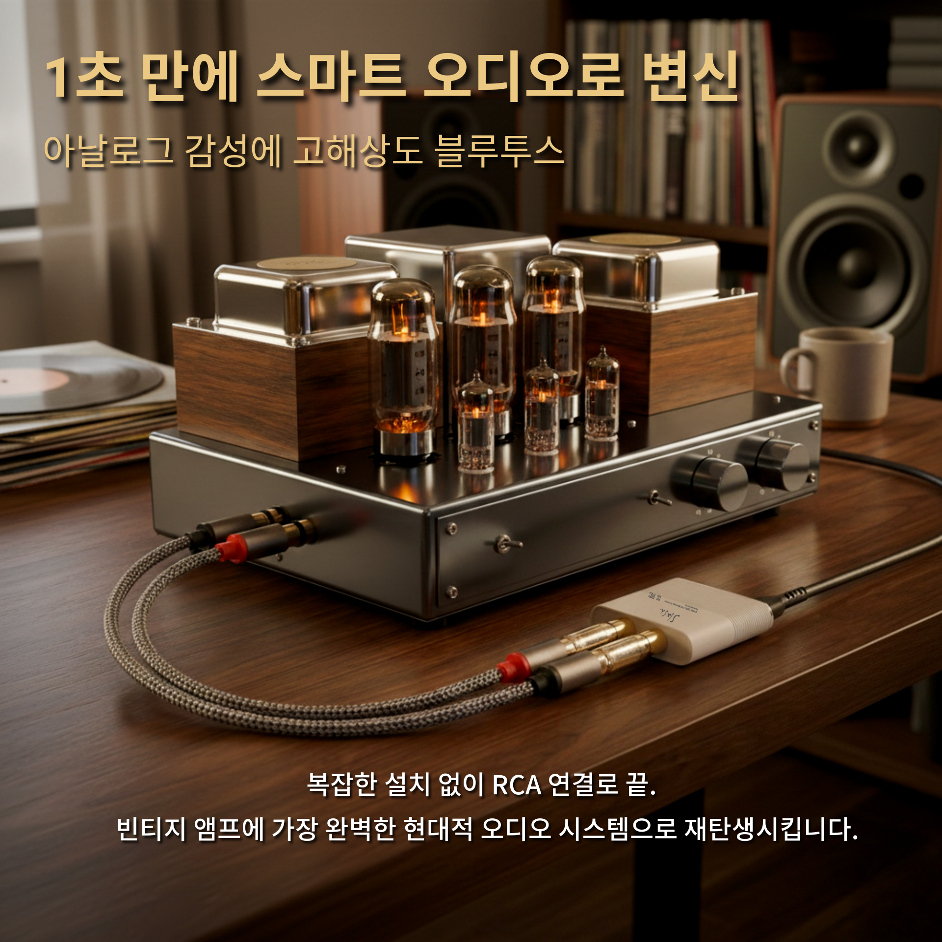 노이즈 없는 "다이렉트 직결" 디자인 앰프의 RCA 입력 단자에 직접 꽂는 특허받은 디자인으로, 지저분한 케이블과 신호 손실을 원천 차단했습니다. 이러한 "Zero-Cable" 구조는 그라운드 루프 노이즈를 제거하여, 스마트폰의 음원을 스피커까지 가장 순수한 상태로 전달합니다.