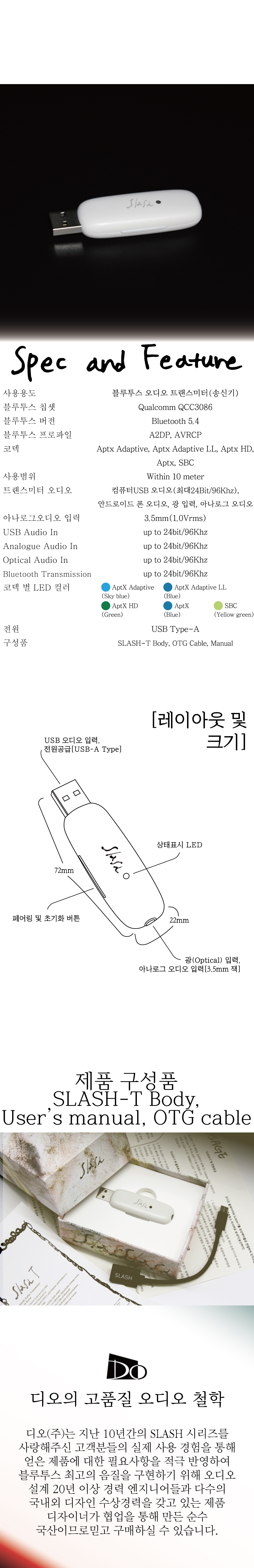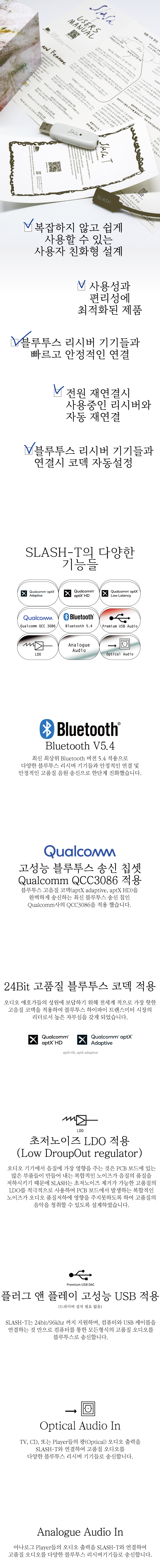 SLASH T 블루투스 5.4 오디오 송신기 (트랜스미터) PC, TV, 게임기에 연결하여 무선 헤드폰/이어폰으로 고음질 사운드를 전송하세요! 최신 aptX Adaptive, aptX HD 코덱을 완벽 지원하여, 영상이나 게임 플레이 시 지연(딜레이) 없는 선명한 하이파이 사운드를 즐길 수 있습니다.