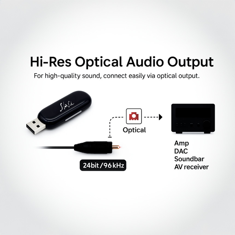 4. [광출력(Optical) & 고성능 헤드폰 앰프] 홈 오디오 DSP나 앰프와 연결할 수 있는 광출력(Optical Output) 포트를 탑재하여 신호 간섭 없는 깨끗한 디지털 연결을 지원합니다. 또한, 고임피던스 유선 헤드폰도 강력하게 구동할 수 있는 고성능 휴대용 DAC로도 활용 가능합니다.