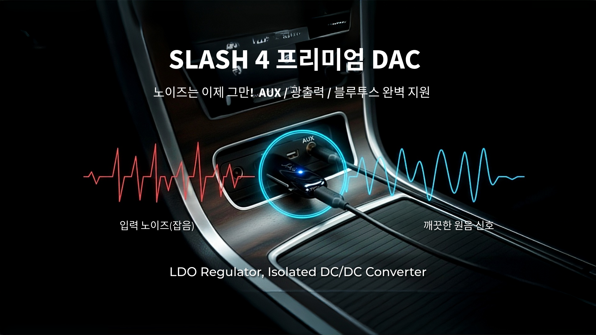 SLASH4 LDAC 고음질 블루투스 DAC 리시버 차량(DSP)과 홈 오디오를 위한 완벽한 업그레이드! 3.5mm AUX, 광출력, 헤드폰 앰프까지 지원하는 올인원 솔루션. LDAC 코덱으로 노이즈 없는 선명한 사운드를 즐기세요.