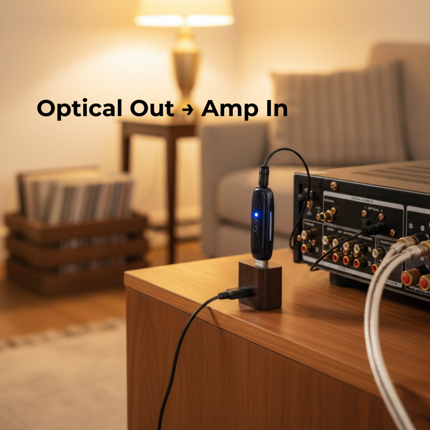 광케이블(Optical)로 앰프에 연결하여 손실 없는 디지털 원음 사운드를 무선으로 즐겨보세요.