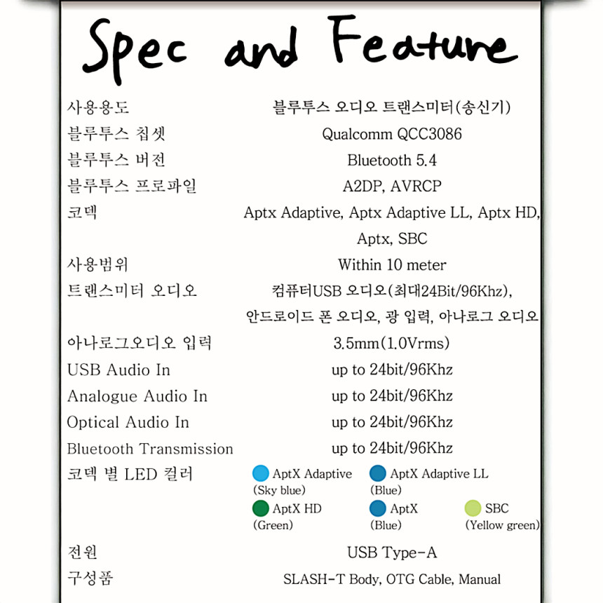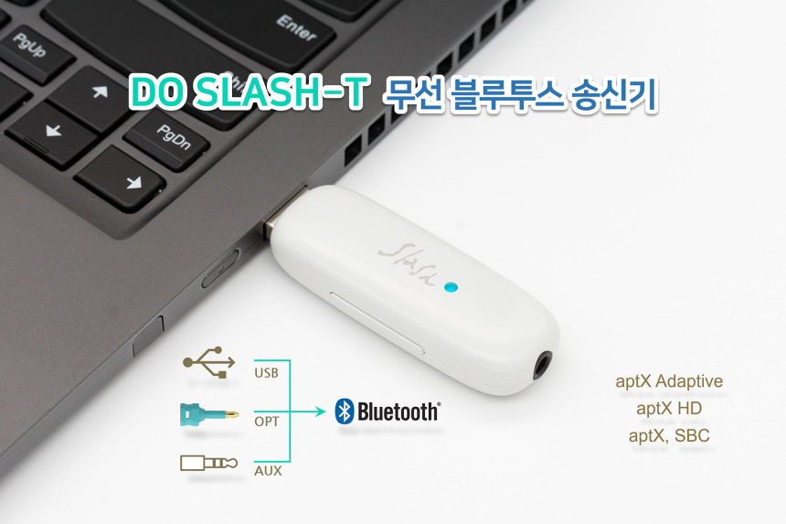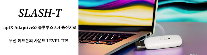 SLASH T 블루투스 5.4 오디오 송신기 (트랜스미터) PC, TV, 게임기에 연결하여 무선 헤드폰/이어폰으로 고음질 사운드를 전송하세요! 최신 aptX Adaptive, aptX HD 코덱을 완벽 지원하여, 영상이나 게임 플레이 시 지연(딜레이) 없는 선명한 하이파이 사운드를 즐길 수 있습니다.