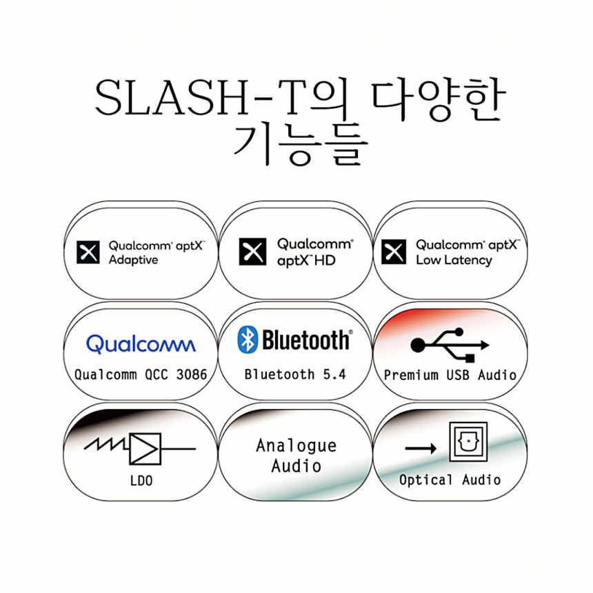 SLASH-T와 SLASH 시리즈 리시버를 결합하여 궁극의 오디오 경험을 즐기세요. aptX Adaptive [24bit/96kHz]를 통해 탁월한 사운드 선명도와 깊이를 경험할 수 있습니다.